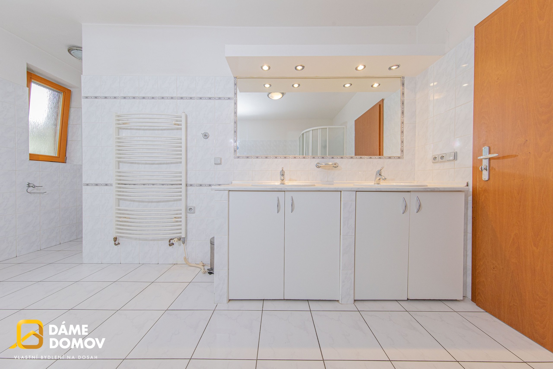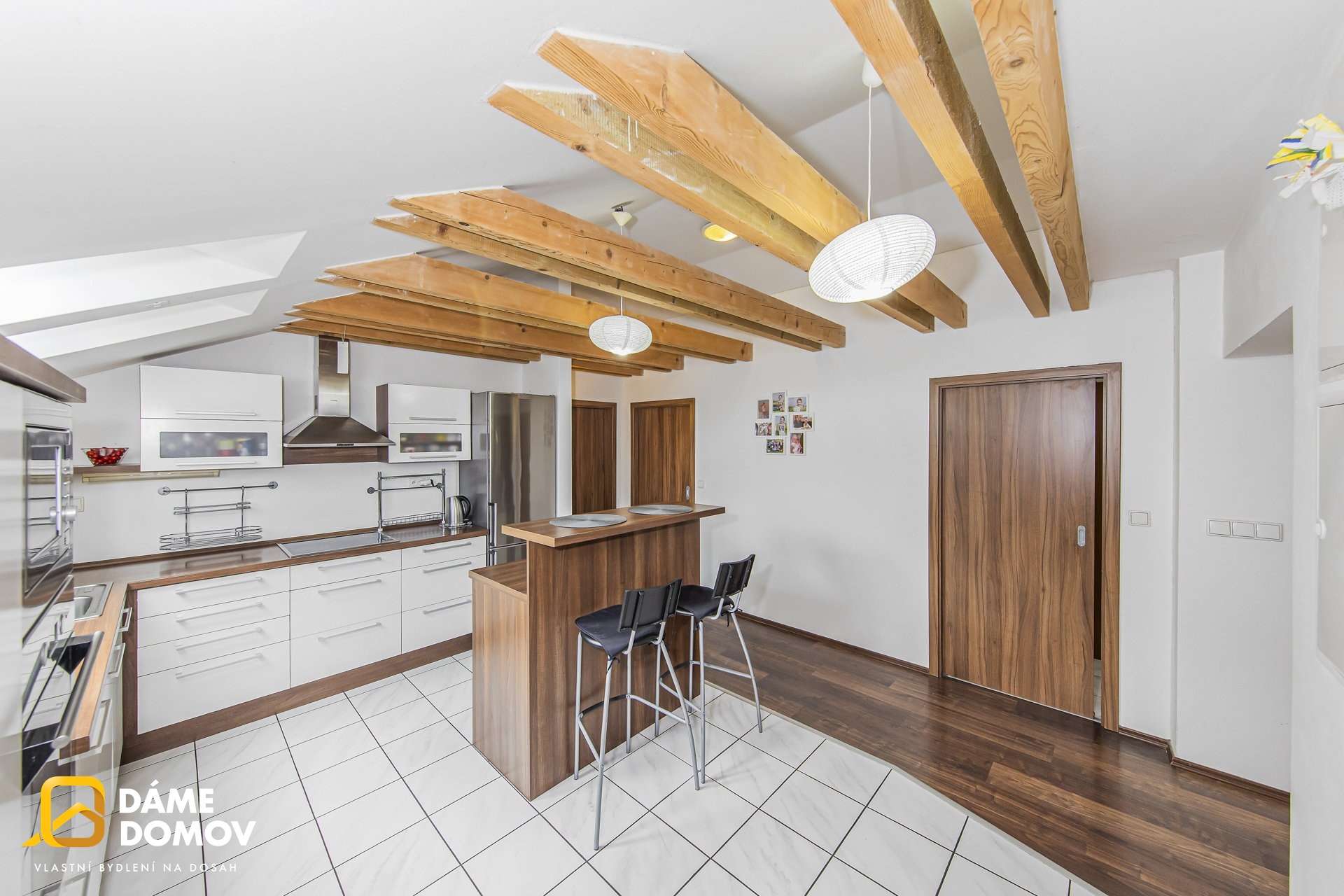 Ve 2. patře se nachází podkrovní byt 4+1 – kuchyň s ostrůvkem, velký obývací pokoj, tři ložnice, šatna, technická místnost a koupelna se sprchou, vanou a WC. Tento byt má samostatný elektroměr a hygienické zázemí.
