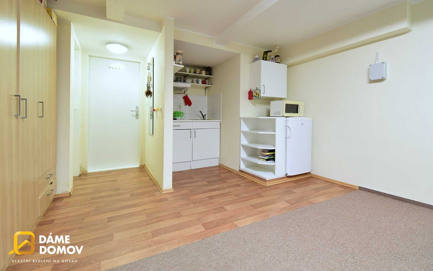 Byt se pronajímá zařízený, jak vidíte na fotografiích, včetně postele, skříně, stolu, kuchyňské linky s varnou deskou, lednicí a rychlovarnou konvicí. Součástí bytu je rovněž koupelna se sprchovým koutem a WC.