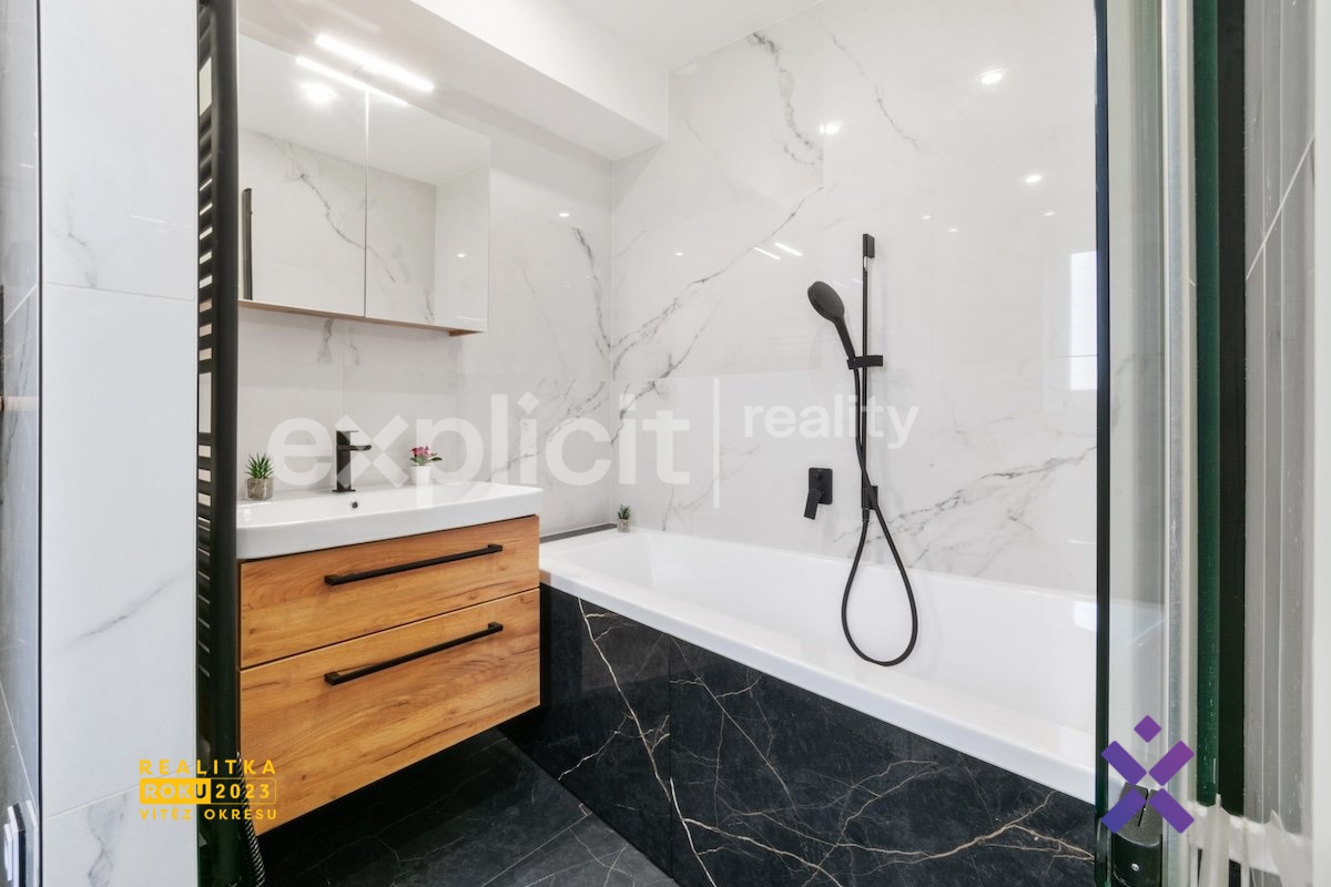 Prostornou chodbou s velkou vestavěnou skříní se dostanete do koupelny, která je zařízena vanou se skleněnou zástěnou a dále samozřejmě umyvadlem a WC, prostor pro pračku a sušičku se nachází na chodbě.