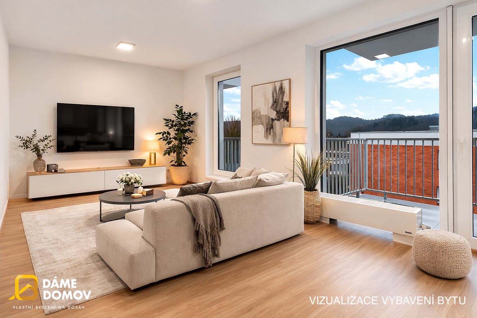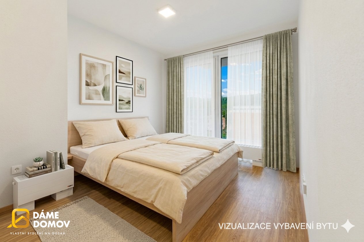 Velkou výhodu je, že každý pokoj má vlastní balkón o velikosti 4 m2. Součástí bytu je také sklep o velikosti 2 m2. Zařízení bytu: kuchyňská linka s vestavěnými spotřebiči, závěsný stolek pod televizi, skříň a odkládací stěna v chodbě, šatní skříň a dvojpostel v ložnici.